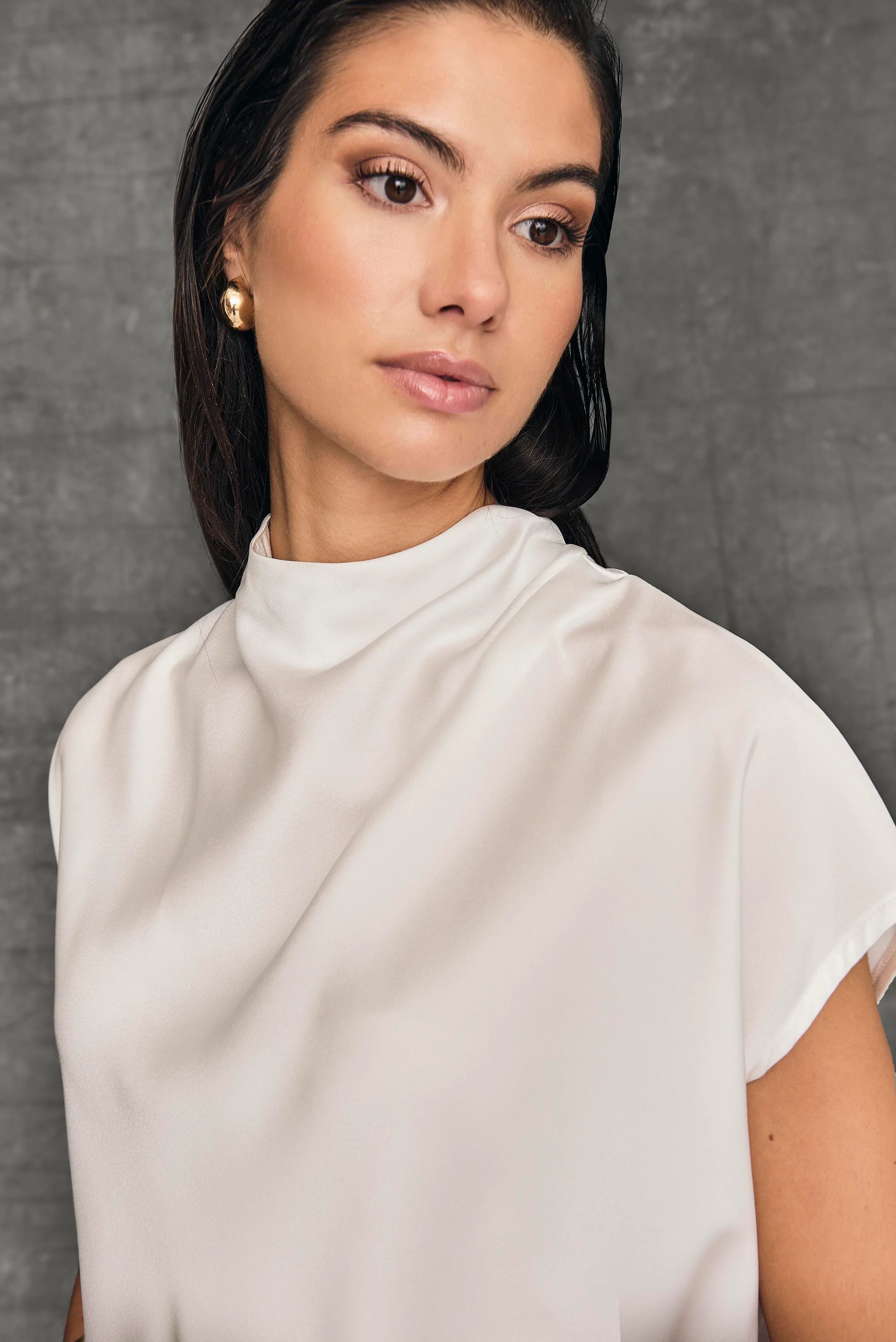Soy Carol, una blusa atemporal confeccionada en satén crudo. Soy versátil y favorezco a todas las siluetas.