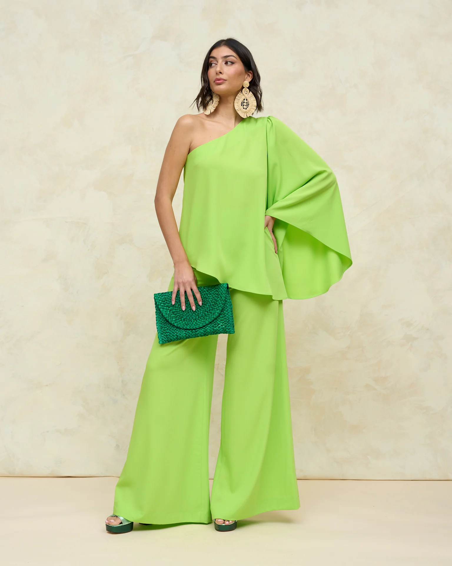Soy Triana, una blusa asimétrica confeccionada en crepe lima y no dejaré a nadie indiferente. Además, mi diseño con una única manga acampanada, te resaltará la silueta.