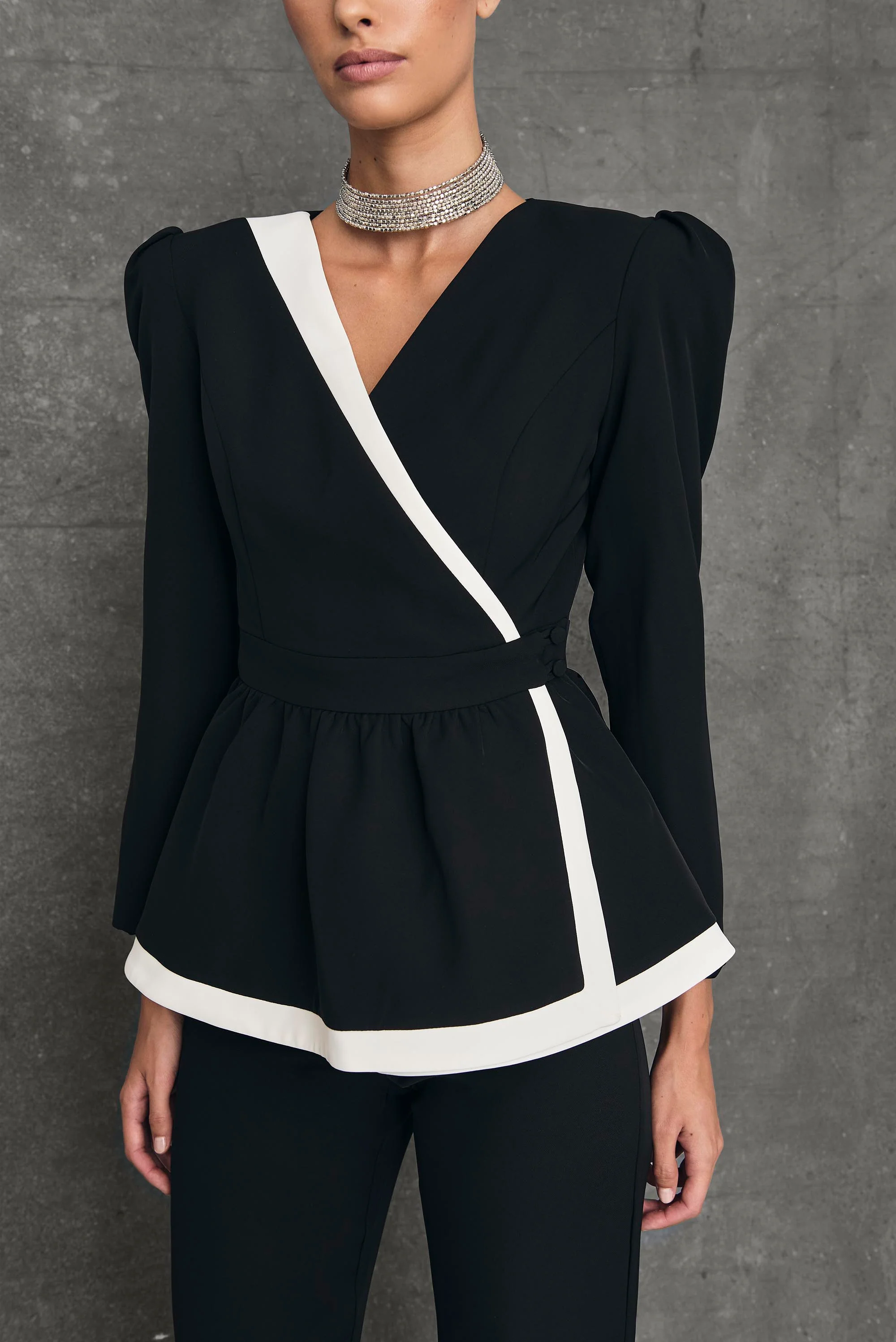 Este traje de dos piezas -chaqueta y pantalón- presenta un corte único gracias a su singular chaqueta cruzada peplum bi-color, que crea un efecto de cintura marcada, mientras que los vivos en contraste añaden un toque diferenciador al look. Las mangas ligeramente abullonadas en los hombros aportan volumen sin perder fluidez. Además, la chaqueta se ciñe a la cintura con un detalle de dos botones laterales que refuerzan la estructura y le otorgan un toque femenino al modelo.