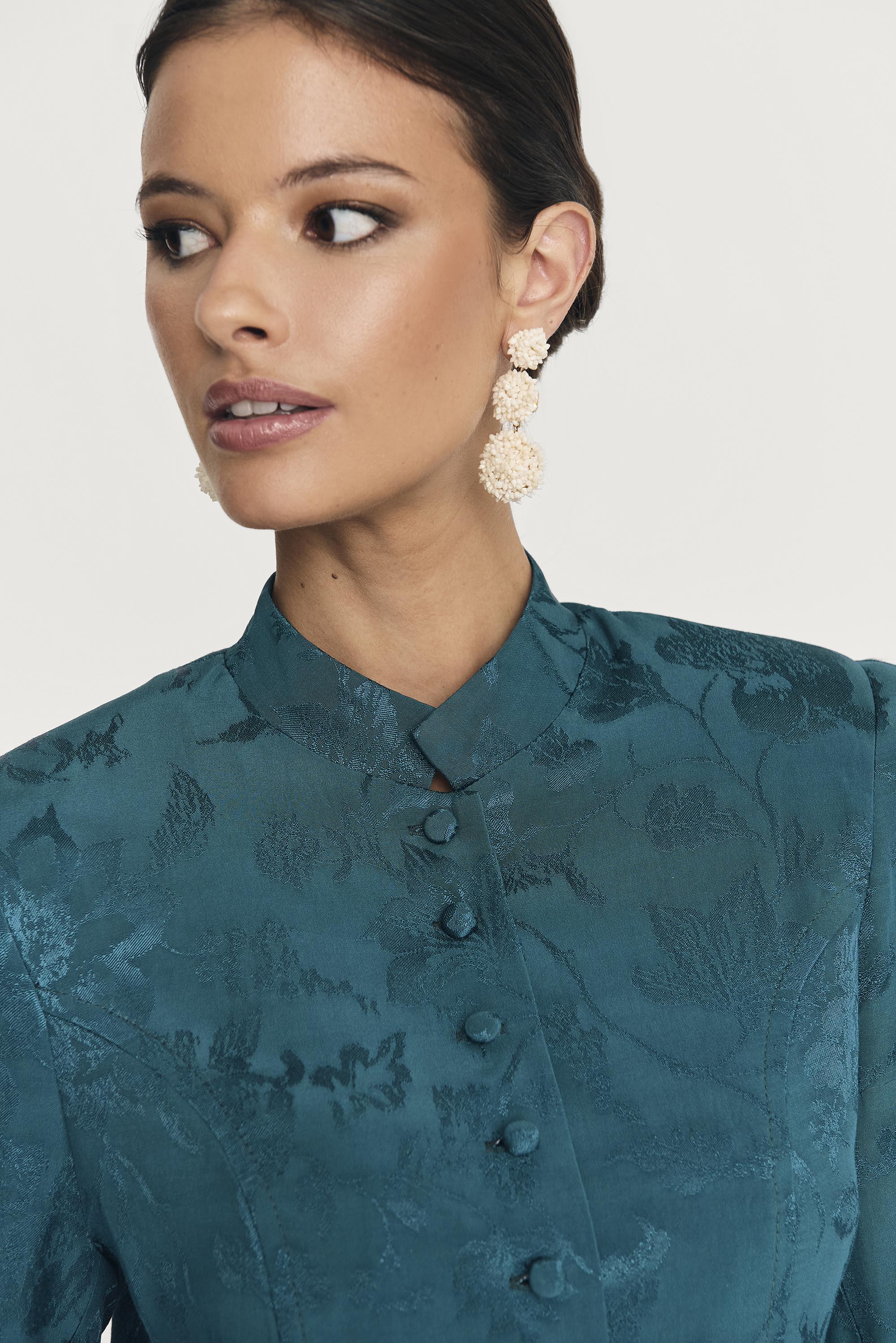 - La chaqueta medieval se caracteriza por su cuello alzado y su fila de botones once forrados. Con un diseño entallado que ajusta a la cintura, contrasta con los hombros estructurados y las mangas tres cuartos.